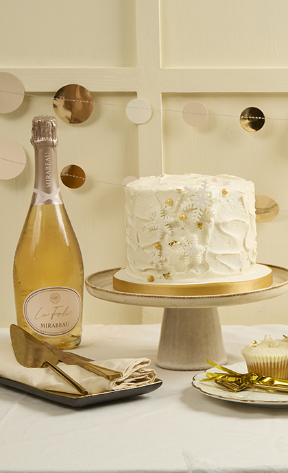 A luxurious pairing of our 6” Red Velvet Snowflake Cake with a bottle of Mirabeau La Folie Sparkling Rosé. Beautifully packaged and ready to gift, this hamper adds elegance and sweetness to any celebration.