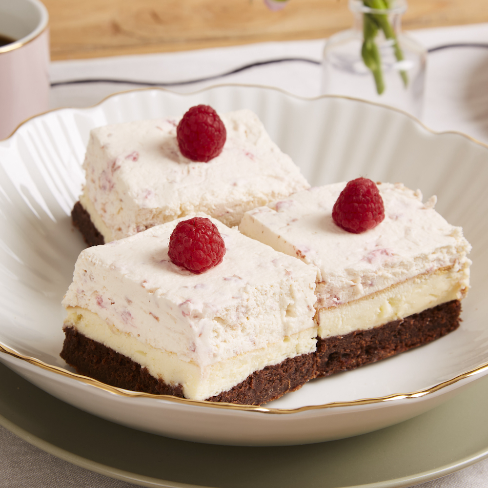 When it comes to indulgent desserts, why settle for one flavour when you can have three? Our Raspberry Cheesecake Brownies combine the richness of fudgy chocolate brownie, the creaminess of baked cheesecake and the lightness of raspberry whipped cream in one irresistible slice. Baked together in layers, this dessert looks as impressive as it tastes, making it perfect for sharing, gifting or treating yourself to something truly special.