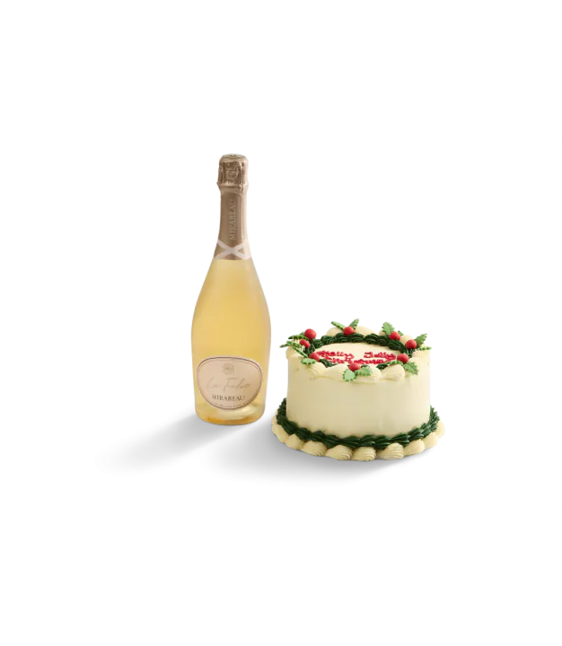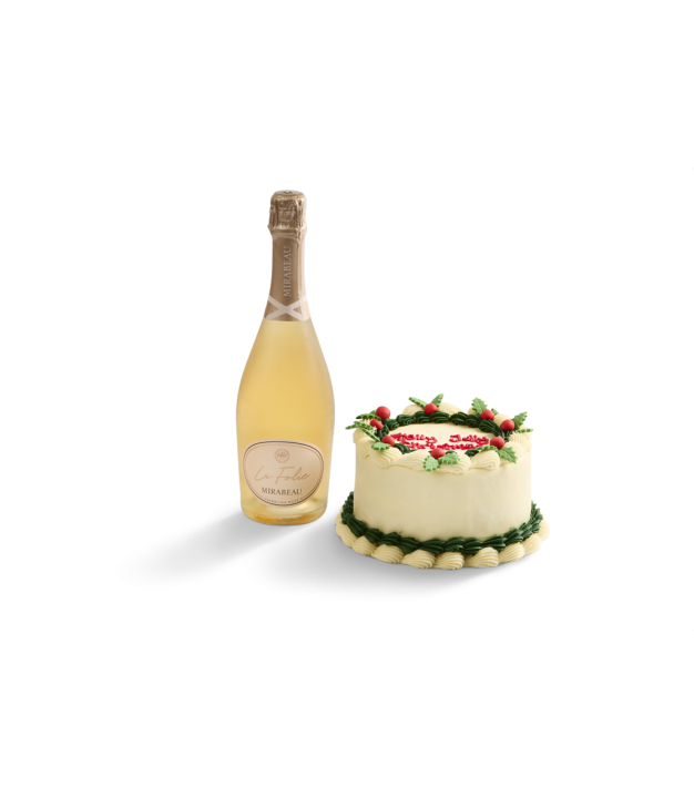 This hamper includes a bottle of Mirabeau La Folie Sparkling Rosé and a 6" Vintage Holly Vanilla Cake.