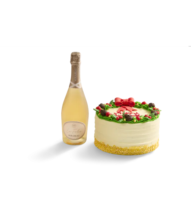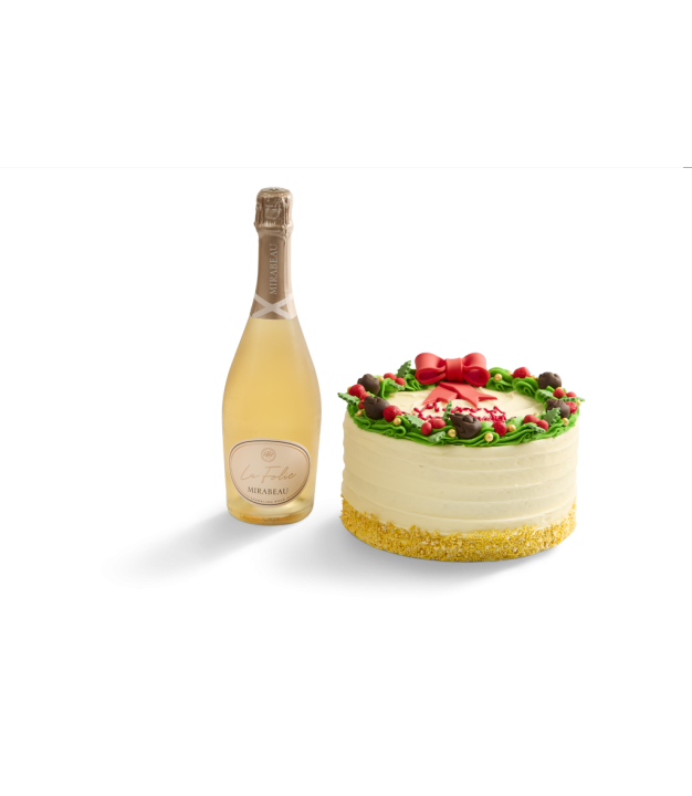 This hamper includes a bottle of Mirabeau La Folie Sparkling Rosé and a 6" Wreath Red Velvet Cake. Our customers’ all-time favourite has taken a festive twist. Step into the enchanting world of Christmas with our extraordinary Christmas Red Velvet Wreath Cake. A centerpiece that will adorn your table with festive splendor and captivate your guests. Deep red vanilla cake with a light taste of chocolate, topped with cream cheese frosting and decorated with a fondant wreath.