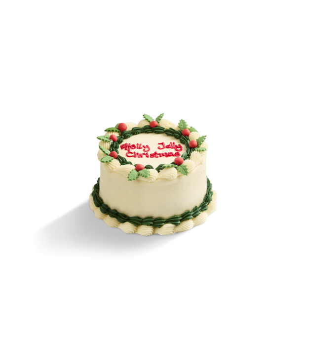 Three layers of soft vanilla sponge, covered in smooth white vanilla buttercream frosting for a timeless, elegant look. Piped with white and holly-green buttercream, and adorned with handmade holly decorations, this festive centerpiece is simple, sophisticated, and full of Christmas charm.